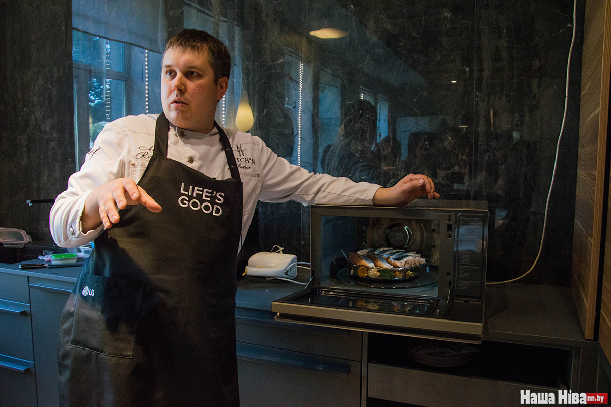 Шеф-повар эти пару недель готовил в микроволновке для своей семьи. Говорит, дети ели и не жаловались. Во время презентации он приготовил лосося с гарниром из овощей, лисичек и оливок.