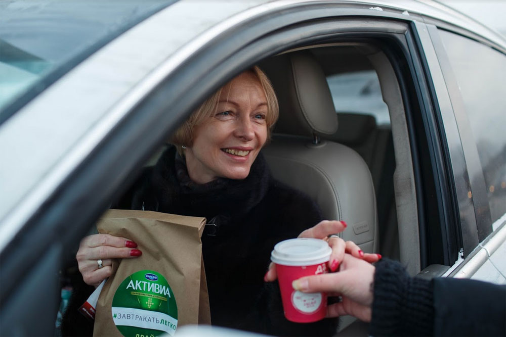 Аўталэдзі не трэба было выходзіць з машыны, каб атрымаць драйв-сэт з ёгуртам «Актывія», садавіной і гарачай кавай. А перакусіць яны змаглі ўжо на працы, дабраўшыся туды не спяшаючыся, затое з хуткім сняданкам.
