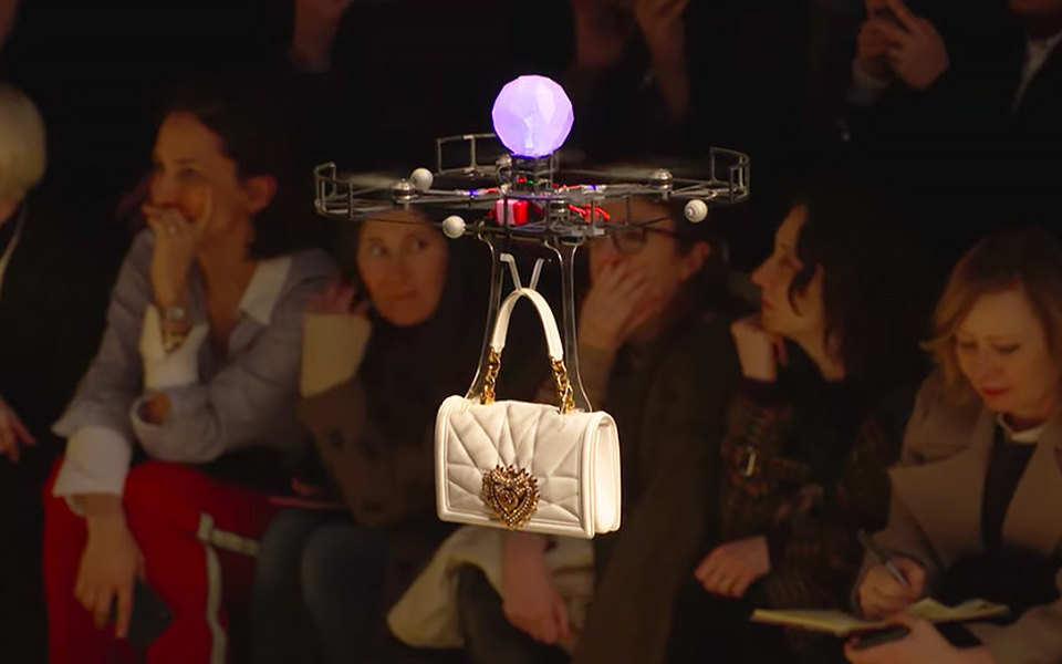 Італьянскі дом моды Dolce & Gabbana ў Мілане паказаў новую лінейку сумачак па-сучаснаму, з выкарыстаннем новых тэхнічных сродкаў: сумкі павесілі на беспілотныя апараты, якія выляталі ў залу пад музыку.
