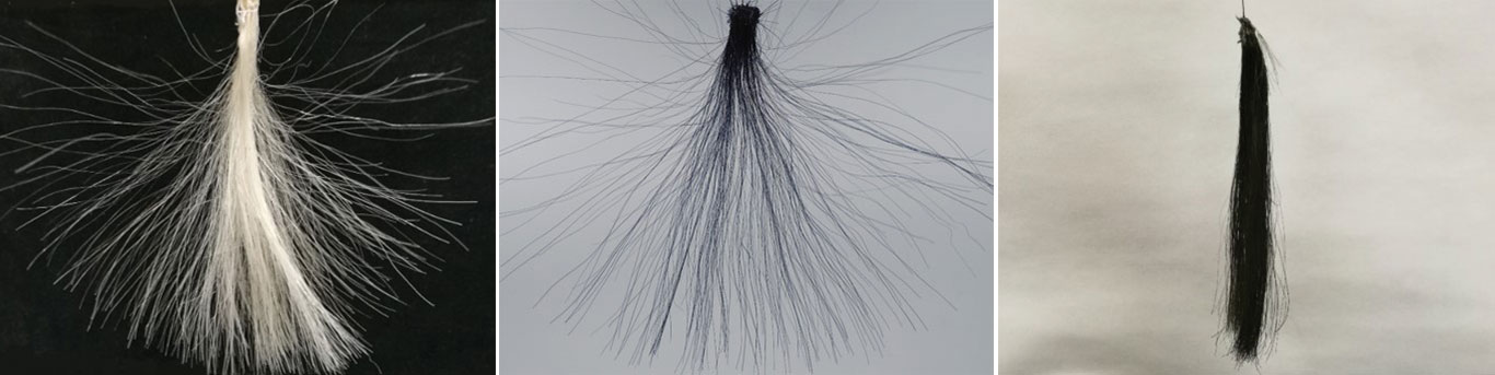 Натуральныя валасы (злева) і валасы, афарбаваныя звычайнай фарбай (у цэнтры), паддаюцца ўздзеянню статычнай электрычнасці і разлятаюцца ў бакі. У той час як валасы, афарбаваныя пры дапамозе аксіду графену (справа), не праяўляюць такой уласцівасці.