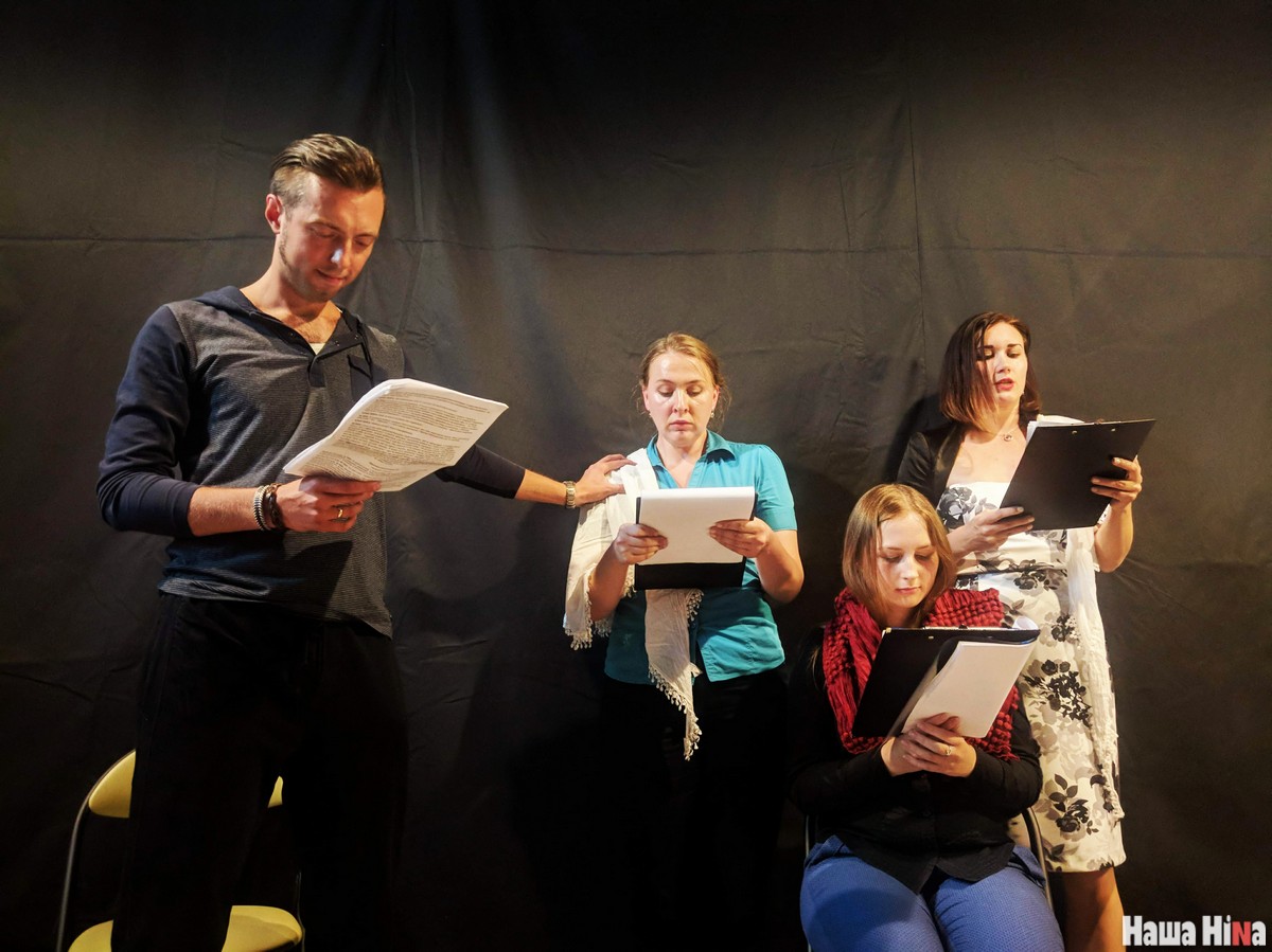 Злева — рэжысёр Павел Лубчонак. Актрысы: Вольга Палітыка, Анастасiя Гузава, Дар'я Пататурка.