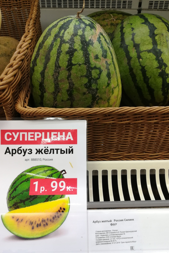 В супермаркетах желтый арбуз стоит вдвое дороже обычного красного. За 1,69 можно купить килограмм испанского арбуза, 1,99 - килограмм российского.